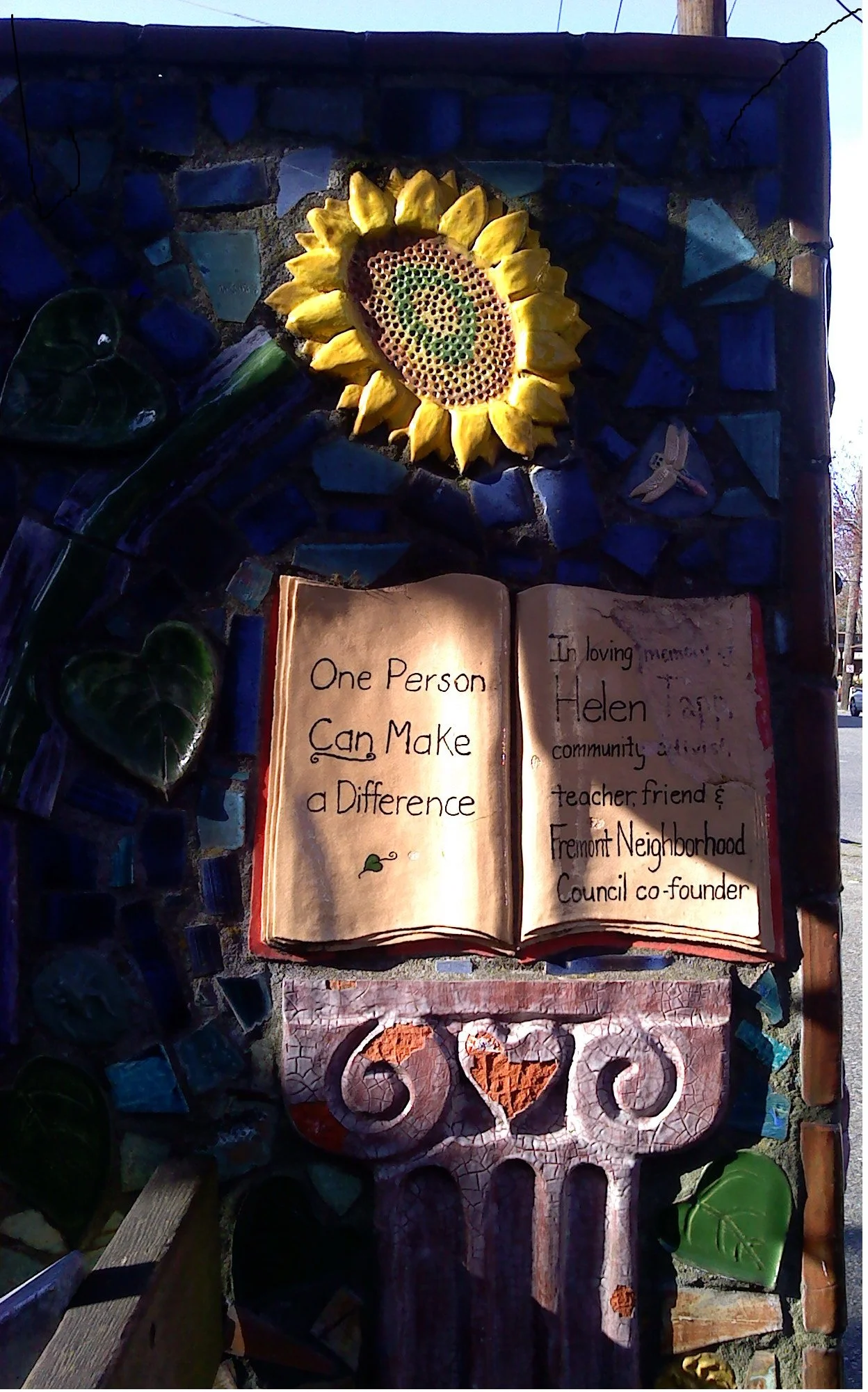 This bench is on private property on Fremont Avenue south of 43rd Street. It was created between 1996-1998. The tile artist, Veronica Truffat, was a member of the Fremont Arts Council. Architect George Heideman was a long-time FNC Board member. Helen Tapp was instrumental in rebuilding the FNC after a hiatus in the 1980s. Read more of the history of Helen Tapp and the bench here.